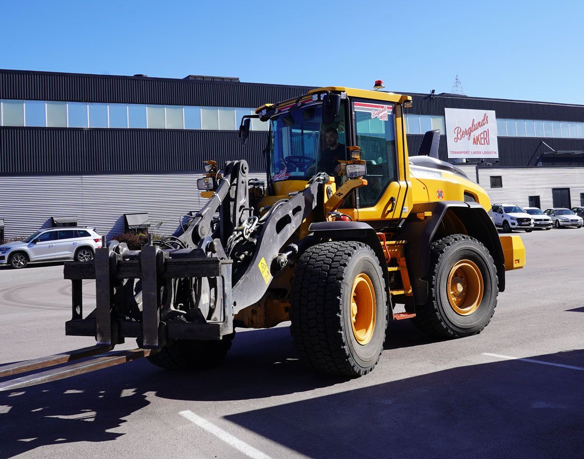Berglunds Åkeri har två lastmaskiner för materialhantering med gafflar eller skopa.